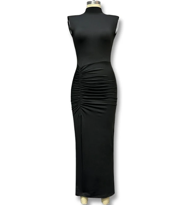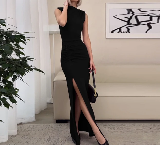 Elegant Party Dresses Woman Summer Solid Color Knitted Sleeveless High Waisted Slit Long Black Dress Sexy Women's Bodycon Dress