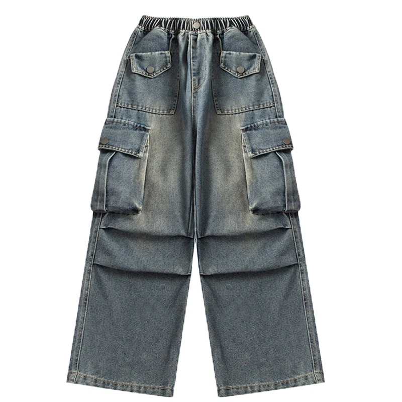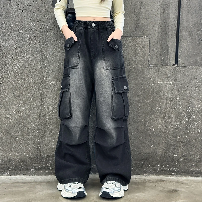 Kids Vintage Distressed Jeans with Pocket For Girls Y2K Fashion High Street Denim Pants Teens Child Baggy Cargo Jeans Trousers