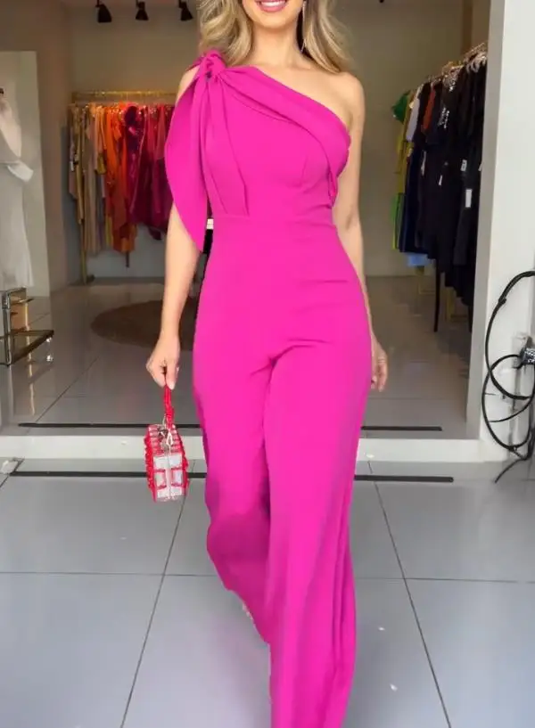 Single shoulder lace up detail bow jumpsuit summer women's elegant solid color slanted neck high waist wide leg jumpsuit