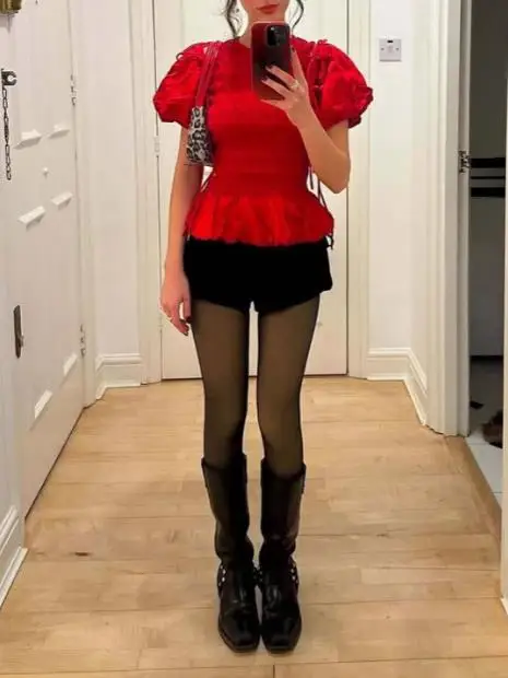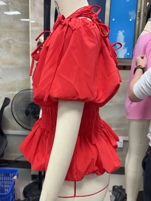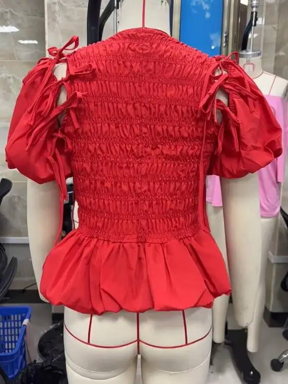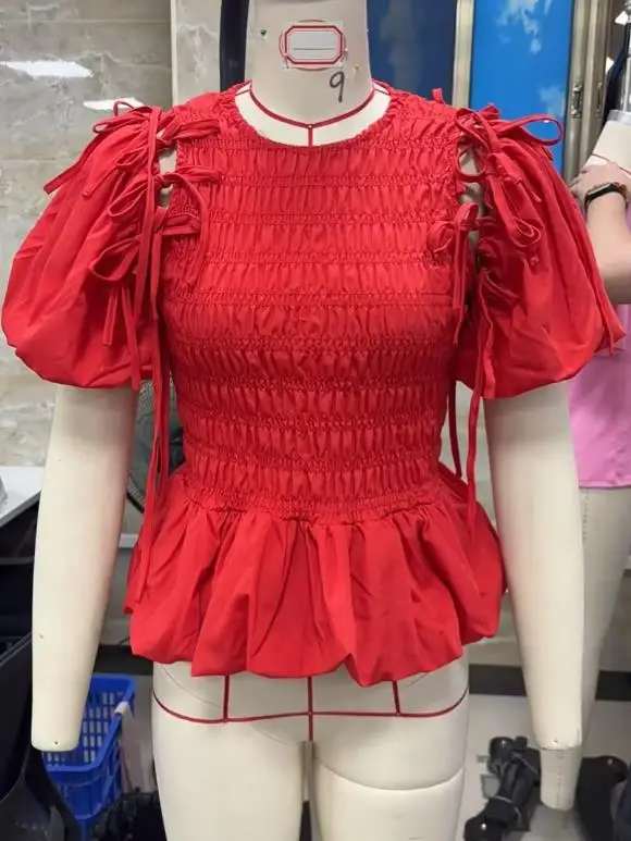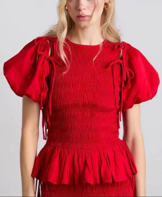 Women's Short Puff Sleeve Tops Solid Color Round-Neck Shirred Tie-up Bow Peplum Blouse